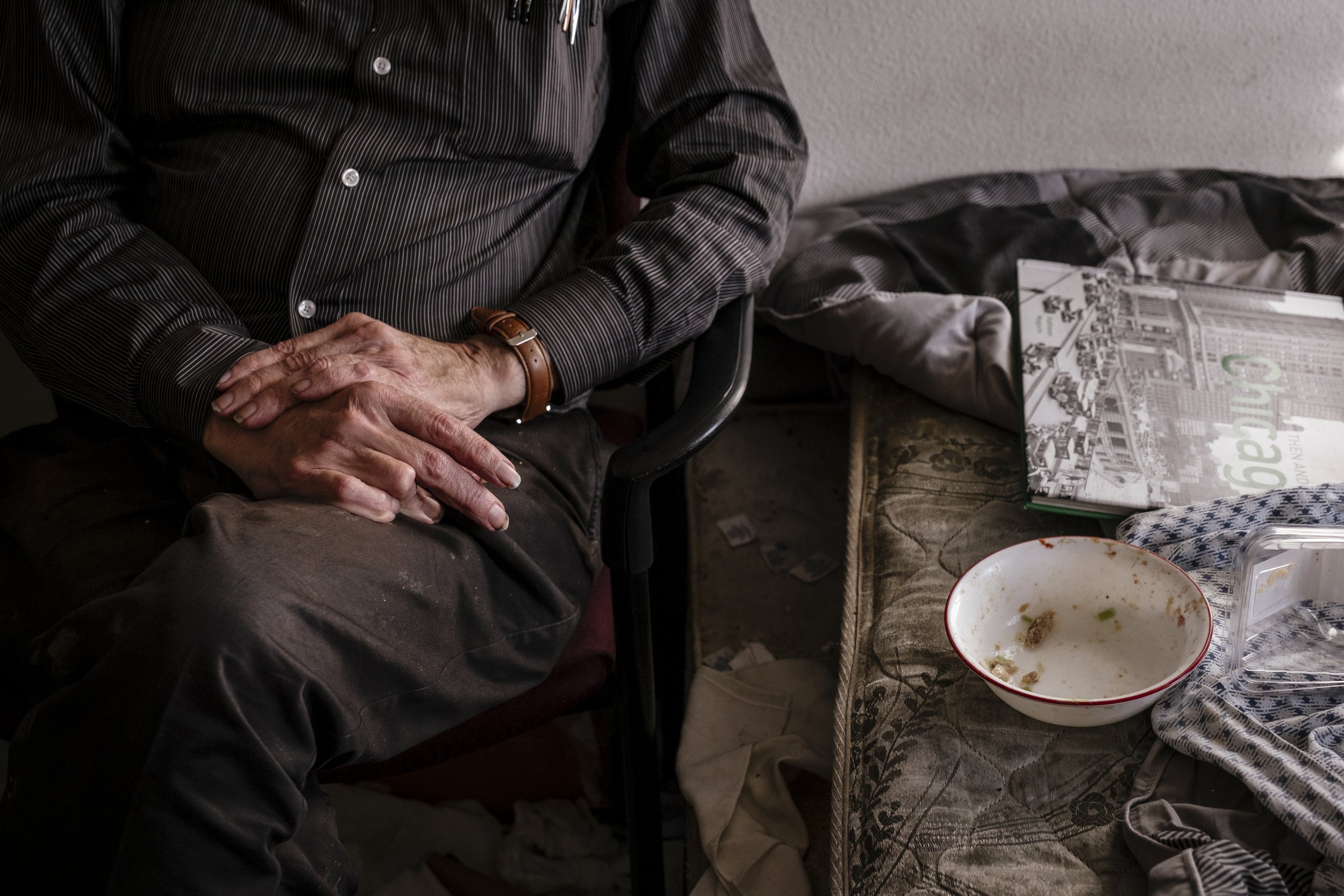 Greg Nowak points across his small apartment, littered with various papers and magazines in Missoula Mt, on Oct. 1.